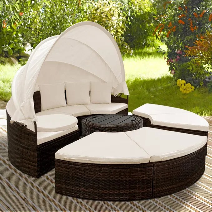 Polyratan je mimoriadne odolný, rovnomerne spletený plastový materiál, ktorý bol špeciálne navrhnutý pre záhradný nábytok. Jeho výhodou je jednoduchá údržba a odolnosť voči nečistotám. Teleskopický stôl WPC je vytvorený z pevného kombinovaného materiálu drevo-plast a jeho rozloženie je veľmi rýchle a nenáročné. Stolová doska zároveň poslúži ako podnos a je vybavená tromi výškovo nastaviteľnými, protišmykovými plastovými nožičkami, ktoré zabezpečujú stabilitu. Stôl má tiež dodatočnú vnútornú polyratanovú výstuž a priestor vo vnútri možno využiť ako úložisko. Odnímateľné poťahy so 7 cm hrubými poduškami na sedadlách odpudzujú vodu a sú ľahko odnímateľné vďaka skrytému zipsu .