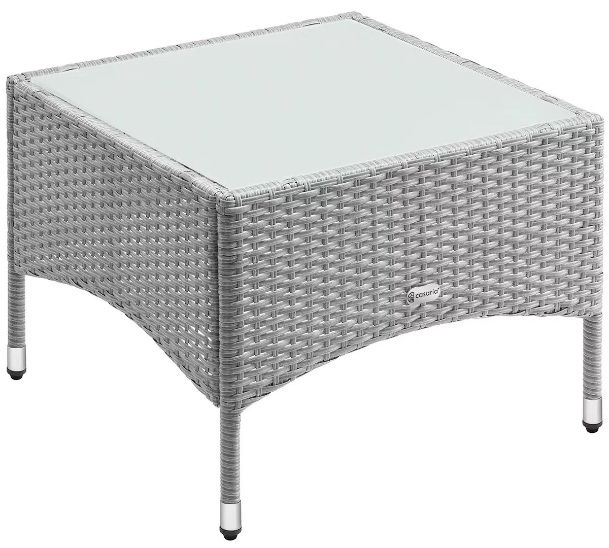 Výplet stolíka je vyrobený z ručne tkaného polyratanu , čo mu dodáva jedinečný vzhľad. Stolová doska z 5 mm hrubého bezpečnostného skla a matným efektom , pridáva stolíku na elegancii. Stolík unesie až 80 kg, pričom jeho konštrukciu tvorí pozinkovaná oceľ s práškovou povrchovou úpravou. Stabilitu zaručujú štyri výškovo nastaviteľné nožičky . Stolík je odolný voči UV žiareniu a vynikajúco sa hodí k inému záhradnému nábytku.