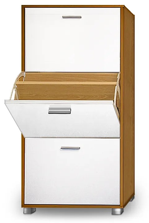 Nadčasová skrinka na topánky s 3 priestrannými policami – elegantné riešenie pre prehľadné uloženie topánok. Botník vás presvedčí moderným dizajnom, priestorovo úspornou veľkosťou. Tri priestranne police s rúčkami v hliníkovom vzhľade vám ponúkajú dostatok priestoru pre všetky vaše topánky. Botník vďaka svojmu nadčasovému modernému dizajnu dokonale zapadne do každého interiéru. Vďaka hĺbke 24 cm je dostatočne úzky, aby našiel miesto aj v malej chodbe .