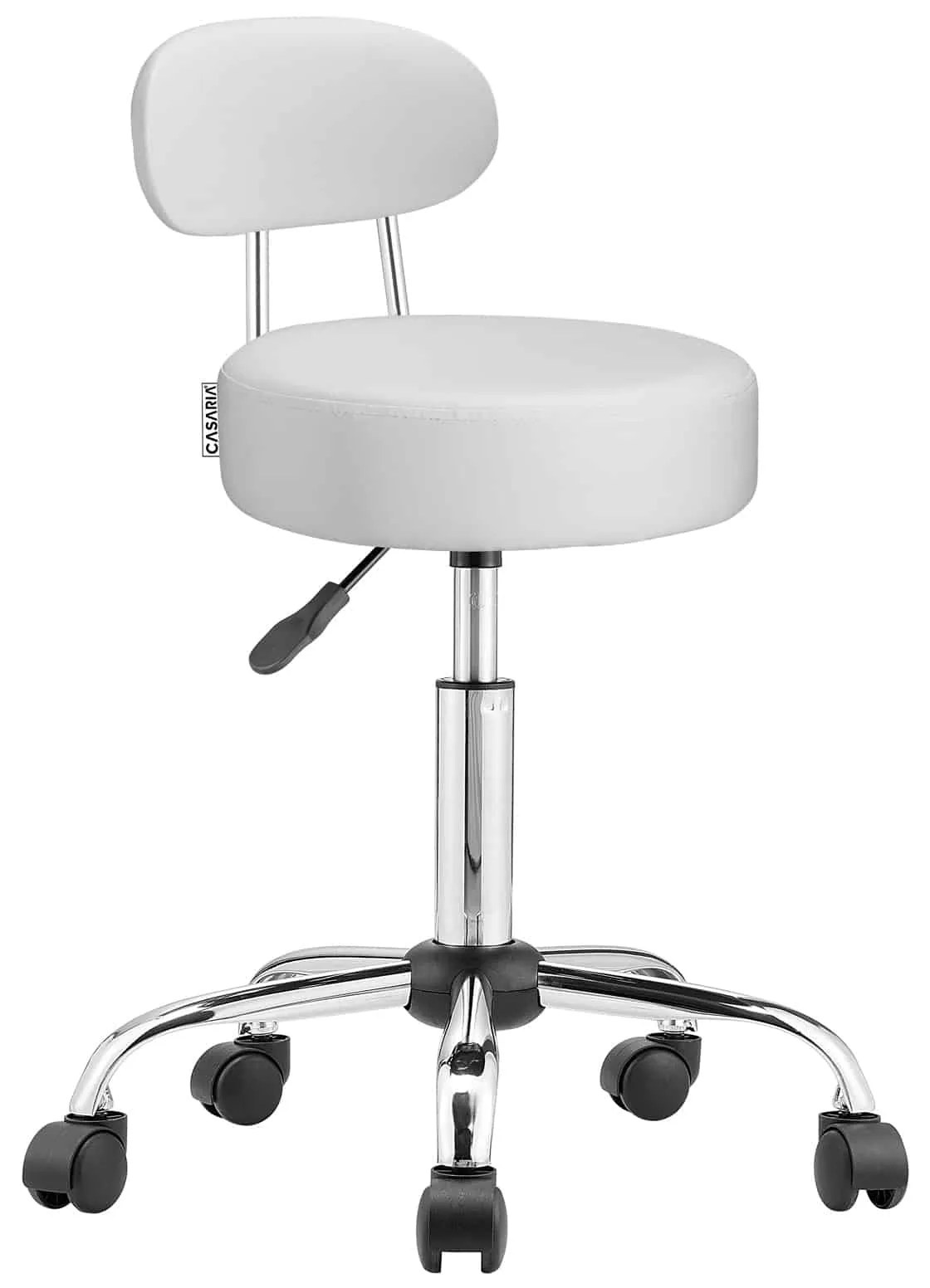 Otočná stolička s operadlom ponúka komfort sedenia a veľkú flexibilitu. Je plynule výškovo nastaviteľná a voľne otočná o 360°. Má tiež pochrómovanú oceľovú základňu s 5 kolieskami pre optimálnu stabilitu. Podsedák s hrúbkou 10 cm a plynová pružina zaisťujú optimálny komfort sedenia. Poťah sedačky je vyrobený z umelej kože, ktorá sa ľahko udržiava a je odolná. To znamená, že hladký povrch sa dá rýchlo a jednoducho vyčistiť .