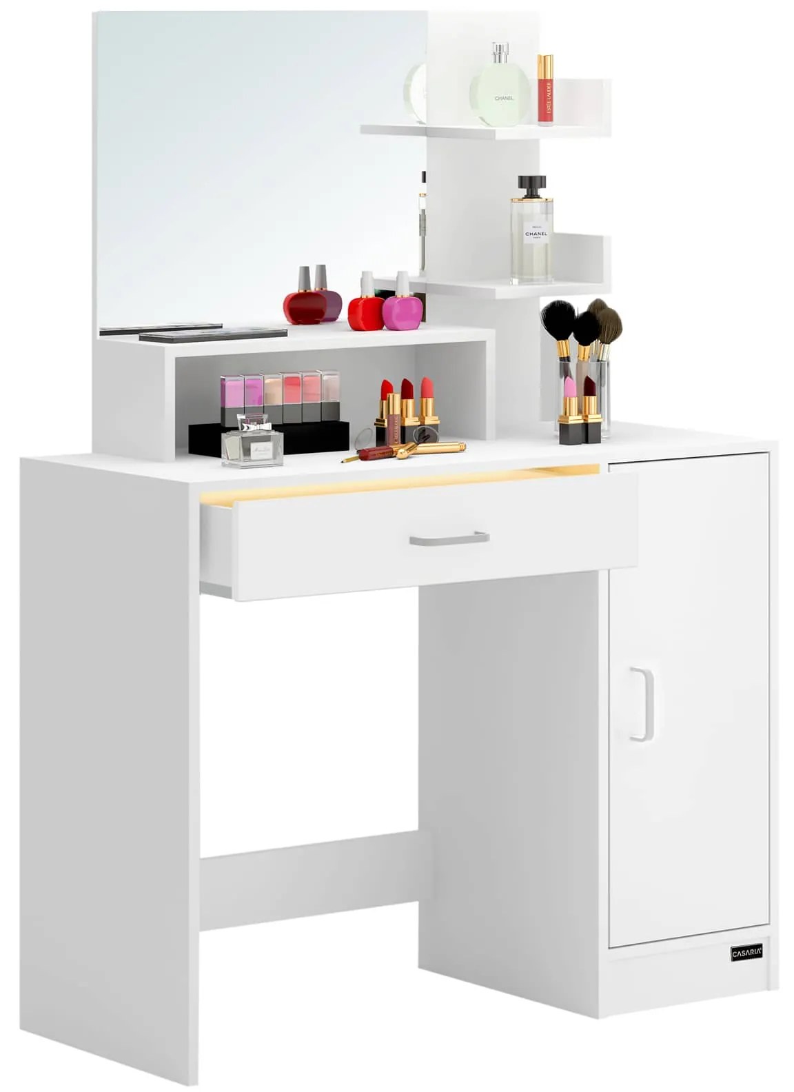 Elegantný toaletný stolík Jocelyn zaujme čistým a nadčasovým dizajnom, ktorý dokonale doplní každú spálňu alebo kúpeľňu. Praktická zásuvka spolu so skrinkou obsahujúcou dve priehradky pod stolovou doskou poskytujú ideálne úložné priestory pre vaše kozmetické potreby či šperky. Zásuvka je vybavená moderným osvetlením ovládaným senzorom na vzdialenosť , čo eliminuje nutnosť manuálneho zapínania. Vždy tak budete mať jasný prehľad o jej obsahu. Hladké kovové koľajničky zaisťujú jednoduché a plynulé otváranie . Povrch stolíka je nenáročný na údržbu – v prípade potreby ho stačí utrieť mäkkou, vlhkou handričkou. Podlahové chrániče na nohách stolíka zabraňujú poškriabaniu podlahy , čím zvyšujú jeho funkčnosť. Stolík sa dá ľahko a rýchlo zmontovať pomocou priloženého návodu. Pre vyššiu stabilitu je možné ho upevniť k stene, čím sa minimalizuje riziko prevrátenia.