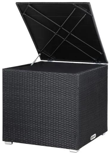 Polyratan odolný voči poveternostným vplyvom a rám z pozinkovanej ocele sú ideálne pre vonkajšie použitie . Povrch záhradného boxu odpudzuje nečistoty a ľahko sa čistí. Celoobvodová vnútorná podšívka z polyesteru sa zapína na suchý zips. Má vodeodolný záter a zips s veľkým otvorom, ktorý ideálne chráni vaše podsedáky pred vlhkosťou a hmyzom. Pevné veko je špeciálne vystužené polykarbonátovou doskou, takže ho môžete použiť ako praktickú policu. Veko boxu je vybavené tlakovou plynovou pružinou pre pohodlné otváranie a zatváranie. Ideálny na balkóny, záhrady alebo terasy.