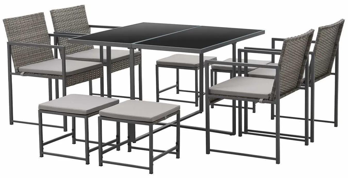 Polyratanová sedacia zostava Bahamas L v šedej farbe pre 8 osoby so stolom, 4 stoličkami, 4 taburetkami a poduškami poskytuje štýlové vonkajšie sedenie. Vďaka svojmu minimalistickému dizajnu vyzerá skvele na terase, v záhrade alebo na balkóne. Vďaka šikovnému tvaru kocky možno záhradný nábytok úhľadne a priestorovo úsporne zložiť. Štyri stoličky sa perfektne zmestia pod stôl. Veľký stôl so sklenenou doskou ponúka dostatok priestoru pre jedlo a nápoje. Zostava je vyrobená z pevného polyratanu ktorý je odolný voči poveternostným vplyvom a trvácny. O komfort sedenia sa postará vysoká elasticita materiálu a podušky ktoré majú odnímateľné poťahy a pri silnom znečistení je možné ich prať.