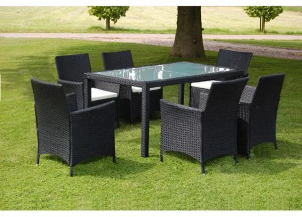 1 stôl so sklenenou doskou, 6 ratanových stoličiek a 6 vyberateľných matracov na sedáky