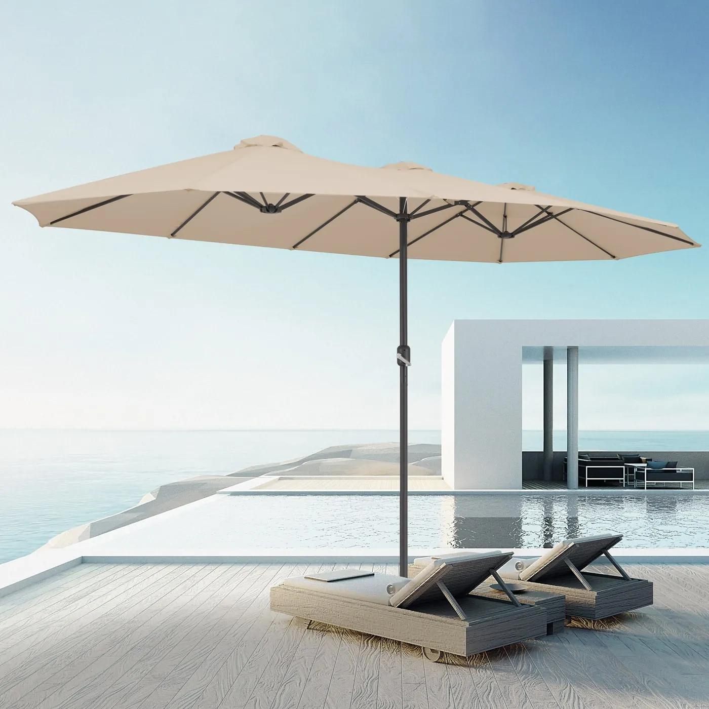 Obrovský slnečník s rozpätím 460 x 270 cm ponúka výnimočne veľkú ochranu pred slnkom pre niekoľko osôb. Vďaka funkcii kľuky s hladkým chodom možno slnečník rýchlo a jednoducho otvoriť. Vďaka UV ochrane 40+ ponúka slnečník optimálnu ochranu pred slnkom. Robustná tyč Ø 48 mm je vyrobená z kvalitnej práškovo lakovanej ocele, ktorú je možné pre ľahšiu prepravu rozdeliť na dve časti. 3 vetracie otvory na vrchu slnečníka zaisťujú ešte väčšiu stabilitu, pretože vzduch prichádzajúci zospodu môže unikať nahor bez ovplyvnenia tienenia. To tiež zabraňuje hromadeniu tepla pod dvojitým slnečníkom.