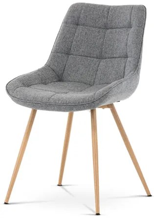 Designová skořepinová jídelní židle je čalouněna šedou látkou s výrazným prošitím sedací části i části určené k opření. Sedací část je zaoblená a má vyvýšené boky, plynule přecházející do opěráku. Polstrování je z kvalitní PU pěny. Čtyřnohá kovová podnož je v 3D dekoru dub. Nohy jsou kruhového průřezu a kónické, ukončené černými platovými kluzáky. Celá podnož je svařená a dodávána jako celek, nehrozí tedy občasné dotahování šroubů jako u podnože šroubované.Toto vše působí nejen jako stylový designový prvek, ale dělá židli velmi pevnou, pohodlnou a praktickou na kratší i delší posezení. Svým provedením ve Skandinávském stylu a decentní barevností se židle hodí nejen k jídelnímu stolu, ale i jako součást pracoven či konferenčních místností.