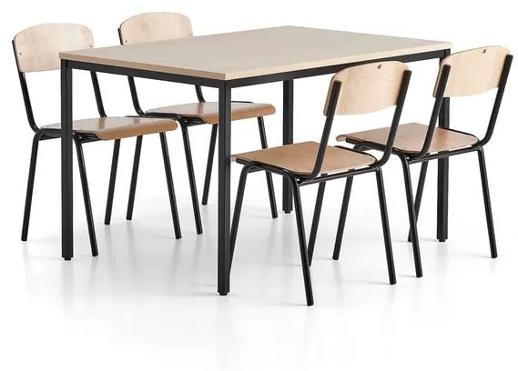 Kompletná zostava nábytku pozostávajúca zo stola a štyroch stoličiek. Stôl je pevný, odolný aľahko sa čistí. Stoličky sú stohovateľné aodolné a ich sedadlá majú mierne zaoblenú prednú hranu. Nábytok je ideálny na použitie napríklad v jedálni. Praktická zostava pre jedálne a iné prostredia, kde je potrebný odolný nábytok. Vďaka masívnemu dizajnu je stôl vhodný do náročnejších podmienok. Laminátová horná doska je odolná a ľahko sa čistí. Rám stola je masívny a je vyrobený zo štvorcových kovových rúrok s práškovou farbou. Stoličky majú jednoduchý, štýlový, ale pevný dizajn. Stoličky môžete rýchlo a jednoducho stohovať, čo zjednodušuje čistenie podlahy alebo šetrí úložný priestor. Sedadlá majú zaoblený predný okraj a opierka chrbta je tiež zaoblená pre väčšie pohodlie. Stoličky majú šikmé nohy pre lepšiu stabilitu.