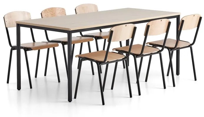 Kompletná zostava nábytku pozostávajúca zo stola a šiestich stoličiek. Stôl je pevný, odolný aľahko sa čistí. Stoličky sú stohovateľné aodolné a ich sedadlá majú mierne zaoblenú prednú hranu. Nábytok je ideálny na použitie napríklad v jedálni. Praktická zostava pre jedálne a iné prostredia, kde je potrebný odolný nábytok. Vďaka masívnemu dizajnu je stôl vhodný do náročnejších podmienok. Laminátová stolová doska je odolná a ľahko sa čistí. Rám stola je masívny a je vyrobený z práškovo lakovaných štvorcových kovových rúrok. Stoličky majú jednoduchý, štýlový, ale pevný dizajn. Stoličky môžete rýchlo a jednoducho stohovať, čo zjednodušuje čistenie podlahy alebo šetrí úložný priestor. Sedadlá majú zaoblený predný okraj a opierka chrbta je tiež zaoblená pre väčšie pohodlie. Stoličky majú šikmé nohy pre dobrú stabilitu.