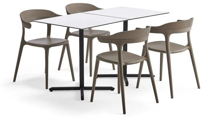 Odolná jedálenská zostava s moderným dizajnom, vhodná do jedální a oddychových priestorov. Jedálenské stoličky sú stohovateľné, majú pohodlné sedadlá a vstavané opierky rúk. Jedálenský stôl má tenkú stolovú dosku vyrobenú z laminátu a štýlový rám. Táto elegantná jedálenská zostava nábytku má atraktívny moderný dizajn. Je odolná a ľahko sa udržiava v čistote, vďaka čomu je ideálna do jedální a oddychových miestností. S kolegami si môžete pohodlne sadnúť k dvom jedálenským stolom. Jedálenské stoly môžete buď spojiť, alebo ich oddeliť, aby ste k nim mohli usadiť dve samostatné menšie skupiny. Stohovateľné jedálenské stoličky Creek sú z jedného kusa a majú zaoblené hrany. Vstavané opierky rúk poskytujú oporu rukám a ramenám, čo je po niekoľkých hodinách práce veľmi príjemné. O pohodlné operadlo sa dá pohodlne oprieť. Jedálenský stôl Becky má štýlový rám a tenkú vrchnú dosku so skosenými hranami a zaoblenými rohmi vyrobenú z ľahko udržiavateľného laminátu. Vďaka kompaktnej veľkosti sa stôl ľahko zmestí do malých priestorov. Zároveň je však možné usporiadať niekoľko stolov do radu a vytvoriť väčší stôl, pri ktorom bude môcť sedieť viac ľudí.