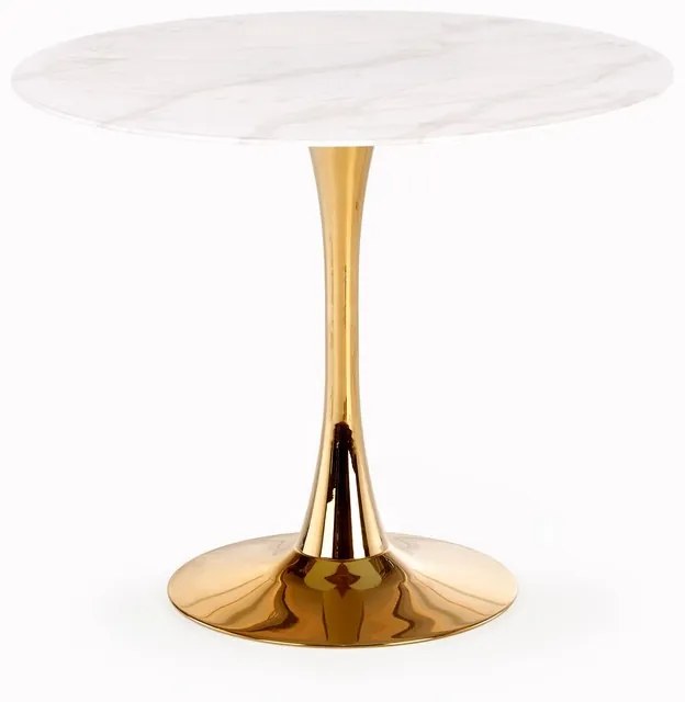 Jedálenský stôl Casemiro Jedálenský stôl Casemiro bude rozhodne ozdobou vašej jedálne, kaviarne či bistra alebo lobby. Elegantné prevedenie stola sprevádza nádych honosnosti vďaka zlatej farbe podnože a efektu mramoru na doske. Podnož z chrómovanej ocele s kruhovou podstavou zaručuje stabilitu stola. Nesie sklenenú dosku s dezénom mramoru, ktorá poskytuje veľa miesta pre tanieriky, hrnčeky a iné riady. Stôl pôsobí elegantným dojmom