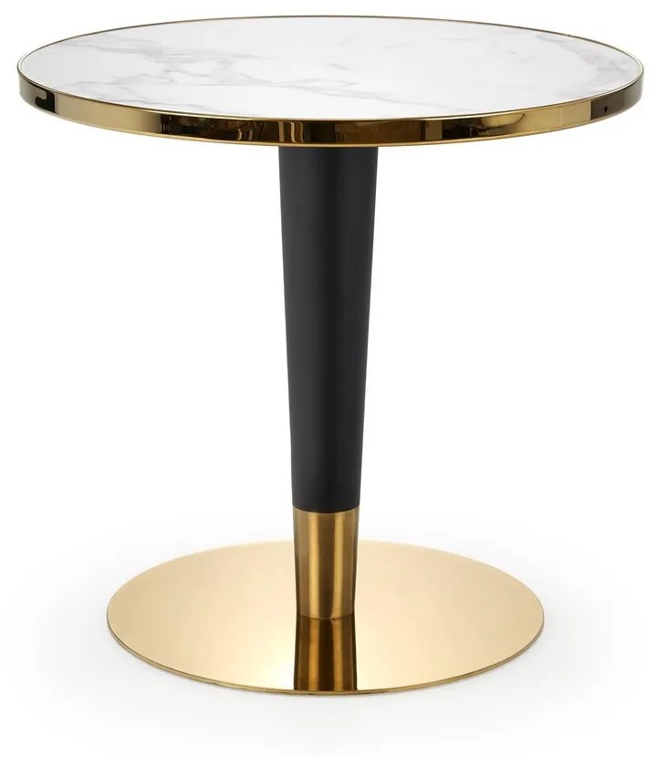 Jedálenský stôl Morata Stôl Morata je svojimi kompaktnými rozmermi a reprezentatívnym dizajnom skvelou voľbou do firemnej kuchyne alebo moderného domova. Kruhová doska má priemer 79 cm a je z keramiky s zaujímavou textúrou bielého mramoru. Pred poškodením ju chráni ochranný lem z chrómovanej ocele vo zlatom lesku. Z nej je vyrobený aj podstavec. Samotná noha je tiež kovová, avšak práškovo lakovaná čiernou farbou. Toto spojenie 3 farieb vášmu interiéru dodá nadčasový šmrnc. Svojimi rozmermi je jedálenský stôl vhodný až pre 3 osoby. Doska zvládne záťaž 20 kg. Elegantný stôl Morata