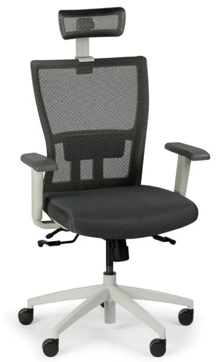 · kancelárska stolička GAS so sedadlom potiahnutým látkou a operadlom zo sieťoviny · synchrónna mechanika s vynikajúcimi ergonomickými vlastnosťami, ktorá upravuje sklon operadla podľa sklonu sedáku · plastové podrúčky s nastavením výšky a šírky umožňujú nájsť optimálnu polohu rúk a dostatok miesta pre sezenie · sedák so šírkou 49 cm a hĺbkou 50 cm, operadlo s výškou 54 cm · oceľový kríž, nosnosť 150 kg · kolieska na mäkké podlahy (napr. koberce, linoleum atď.) · úhlovo a výškovo nastaviteľná hlavová opierka pre ideálnou oporu · výškovo nastaviteľná bedrová opierka pre oporu bedrovej chrbtice