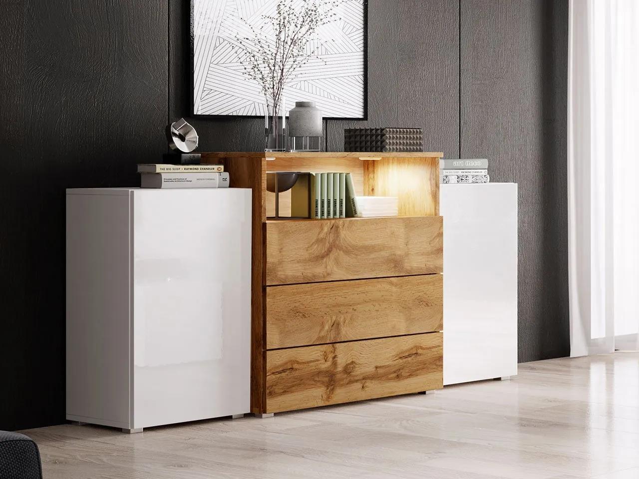 Umiestnením modernej komody Layla II môžete zdôrazniť jedinečný charakter svojej obývacej izby. Kombinácia najmodernejších farieb oživí priestor a dodá mu nádych extravagancie. Zaujímavý tvar nábytku zasa dodáva interiéru originálny vzhľad.Za zvýšenú funkčnosť komody je zodpovedný šikovný úložný priestor. Bočné skrinky sú praktickým úložným priestorom pre väčšie predmety a centrálne umiestnený rad zásuviek je praktickým úkrytom pre často používané príslušenstvo a pomôcky. Každá zo zásuviek sa ľahko otvára vďaka systému push to open.Rozmery:šírka: 150 cm,výška: 81 cm,hĺbka: 39 cmPrevedenie:16 mm hrubá laminovaná doska,čelá: matná alebo lesklá doska 15 mm,ABS hrany, zadné okraje papiera,valčekové vodidlá,model bez držadiel, otváranie pomocou čela vyčnievajúceho nad telo,dve zásuvky majú systém otvárania „PUSH TO OPEN“,biele LED osvetlenie ako doplnková možnosť za príplatokRozmery produktu sú uvedené v centimetroch a môžu sa líšiť od skutočných ± 3 cm.Rozmery nábytku nemeníme na žiadosť zákazníkovZáruka: 24 mesiacov