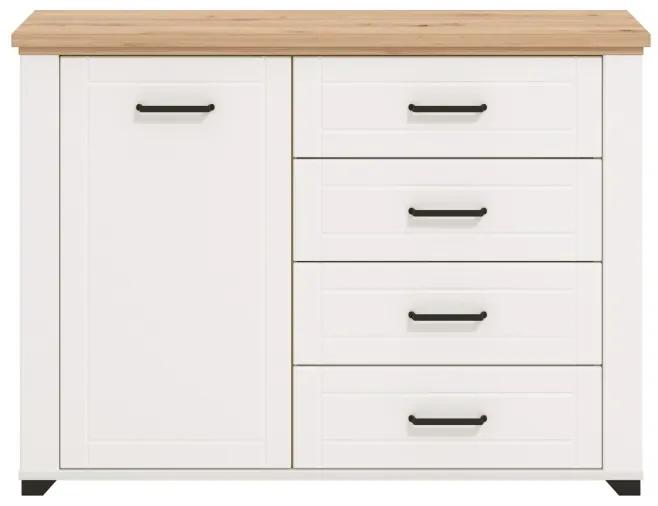 Kombinovaná komoda ponúka úložné priestory vo forme 4 zásuviek a 1 skrinky kryté dvierkami. Usadená je na drobných nôžkach, ktoré sú zladené do rovnakej čiernej farby ako úchytky. Profilované čelá dvierok a zásuviek sú z MDF dosky a pokryté bielou matnou fóliou. Korpus celej komody je vyrobený z lamina v bielej farbe.