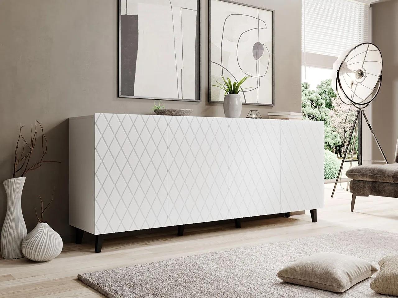 Moderný nábytok do obývačky Deziko zaujme svojimi frézovanými frontmi, ktoré sú nevyhnutným prvkom moderného interiérového dizajnu. Geometrické usporiadanie vzorov vyzerá veľmi zaujímavo a elegantne. Celok dopĺňajú vysoké nohy, zdôrazňujúce ekonomický štýl nábytku.Široká komoda Deziko sa vyznačuje nielen vizuálnou stránkou, ale je aj veľmi praktická. Vnútorný priestor tvorí až osem priestranných políc, ktoré úspešne uskladnia rôzne druhy predmetov. Veľké rozmery a funkčné riešenia robia z komody dokonalý kus nábytku do obývačky a spálne.Rozmery:šírka: 200 cm,výška: 82 cm,hĺbka: 42 cmPrevedenie:korpus: matná laminovaná doska, hrúbka 16 mm,predná strana: laminovaná MDF doska potiahnutá 16 mm hrubou PVC fóliou s viditeľnými frézami,ABS hrana 0,45 mm,prekrývacie pánty,žiadne rukoväte – fronty mierne vyčnievajú nad dosku,plastové nohyRozmery produktu sú uvedené v centimetroch a môžu sa líšiť od skutočných ± 3 cm.Rozmery nábytku nemeníme na žiadosť zákazníkovZáruka: 24 mesiacov