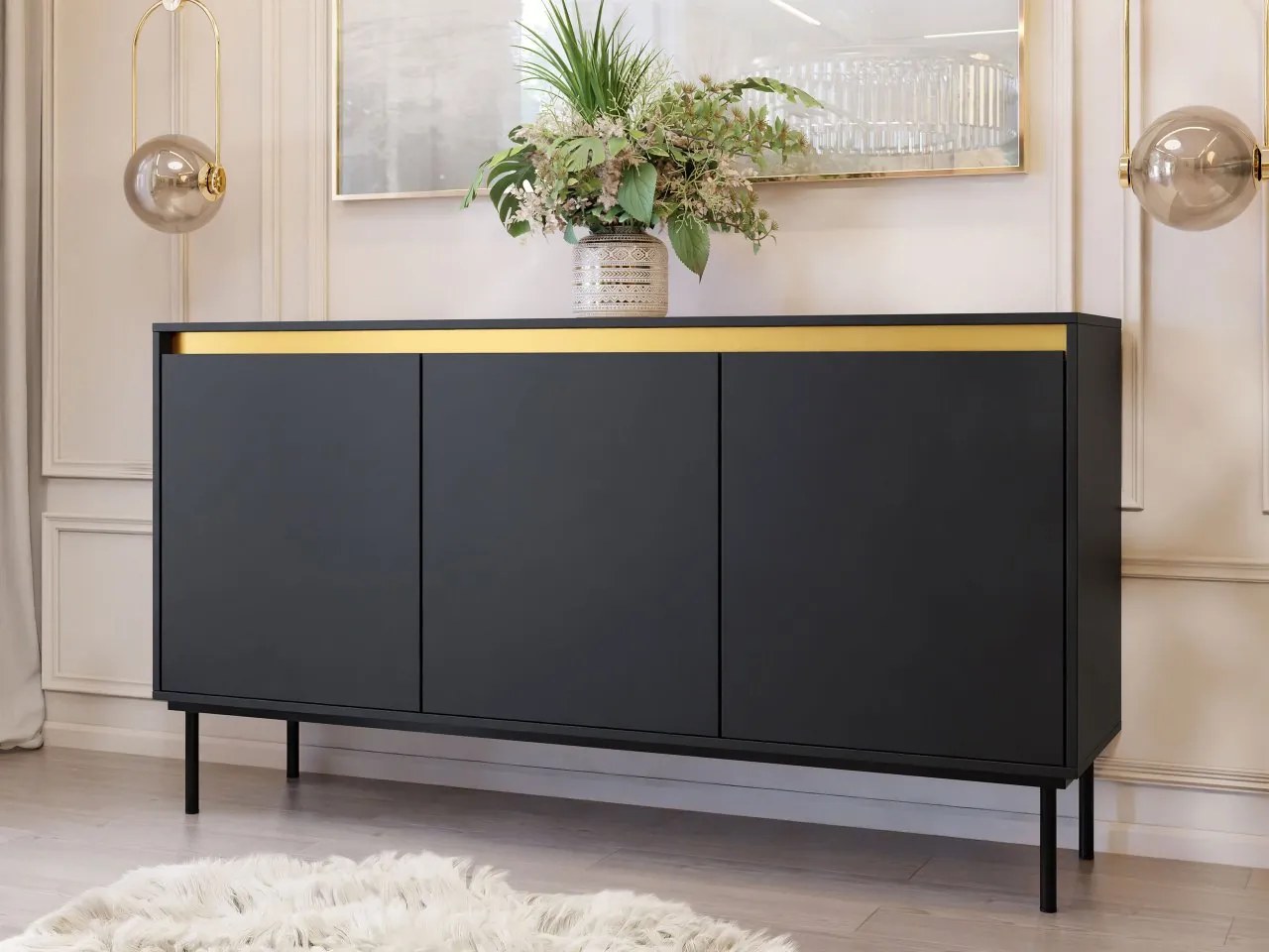 Rozmery: šírka: 160 cm výška: 86 cm hĺbka: 40 cmPrevedenie: 16 mm hrubá laminovaná doska papierové lemovanie zadná stena z HDF dosky kovový rám: farba čierna – čierna farba zlato – biela GTV pánty bez úchytiek – otváranie pomocou frontuRozmery výrobku sú uvedené v centimetroch a môžu sa líšiť od skutočných o ± 3 cm.Rozmery nábytku nemeníme na prianie zákazníkaZáruka: 24 mesiacov