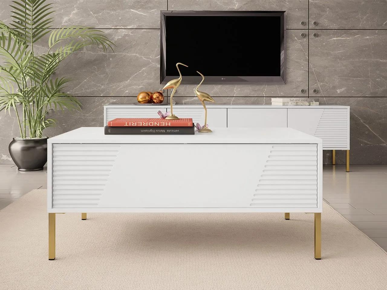 Konferenčný stolík Miretiz 07 je mimoriadne funkčným a štýlovým prvkom vybavenia obývačky. Jeho jedinečný dizajn dodá eleganciu a triedu každému interiéru. Stolík s úložným priestorom vám pomôže mať po ruke všetky potrebné predmety, ako sú diaľkové ovládače, elektronické zariadenia alebo knihy. Model zdobený jemným frézovaním a subtílnymi nožičkami upúta pozornosť každej návštevy!Moderný konferenčný stolík do obývačky vám spríjemní deň. Ideálne na stretnutia s vašimi blízkymi pri kávičke a koláčiku. Alebo možno organizujete večer stolových hier? Miretiz 07 je perfektný priestor na umiestnenie dosky s dielikmi, kartami a občerstvením. Na čo si treba dať pozor je bezúchytkový systém otvárania. Na otvorenie skrinky stačí zľahka stlačiť prednú časť nábytku. Inovatívne a praktické riešenie pre vaše pohodlie.Rozmery:šírka: 100 cm,výška: 46 cm,hĺbka: 60 cmPrevedenie:korpus: laminovaná drevotrieska hrúbky 16 mm,fronty: 18 mm hrubá MDF doska,PVC okraj 0,6 mm,kovový profil 18 cm vysoký:zlato – biela, čierna,čierna – kašmír,pánty,plynový zdvihák,bez rukovätí,systém otvárania “PUSH TO OPEN”.Záruka: 24 mesiacov