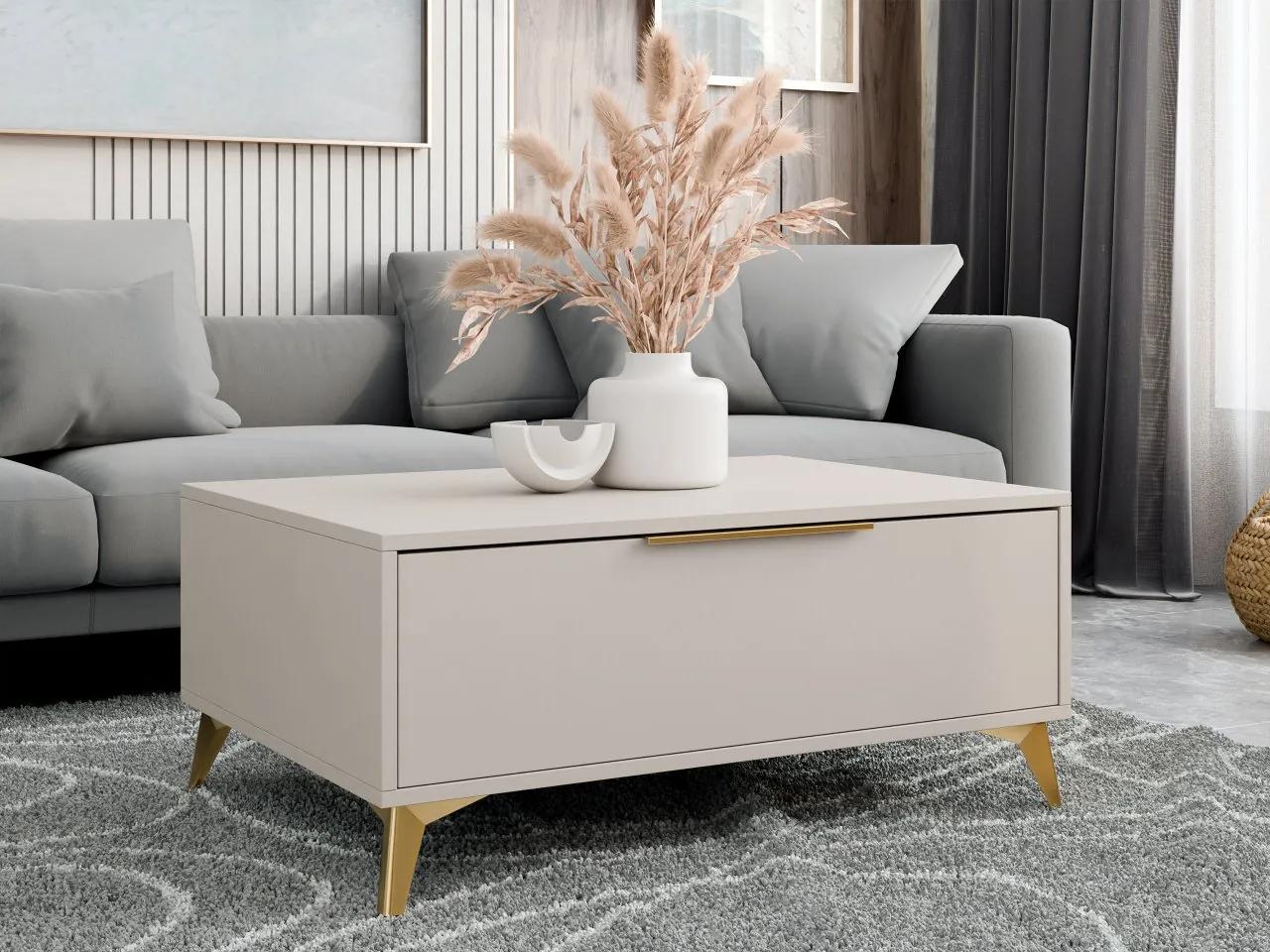 Konferenčný stolík Siprynt 1SZ so zásuvkou je elegantná ponuka, ktorá doplní relaxačný kútik vo vašej obývačke. Na základe vysokých kovových nôh zlatej farby pôsobí veľmi štýlovo.Priestranná stolová doska ponúka priestor pre štýlové dekorácie, ale aj šálku horúcej kávy alebo občerstvenie. Výsuvná odkladacia priehradka je dobrým miestom pre veci, ktoré nepotrebujete vidieť, ako sú káble, notebook alebo noviny.Konferenčný stolík do obývačky zaujme svojim vzhľadom a poskytuje funkčnosť a každodenný komfort.Rozmery:šírka: 104 cmvýška: 45 cmhĺbka: 75 cmPrevedenie:korpus: 16 mm hrubá laminovaná doskačelá: 16 mm hrubá MDF doskaABS hrananohy a rukoväte: kov zlatej farbyguľôčkové vedenia