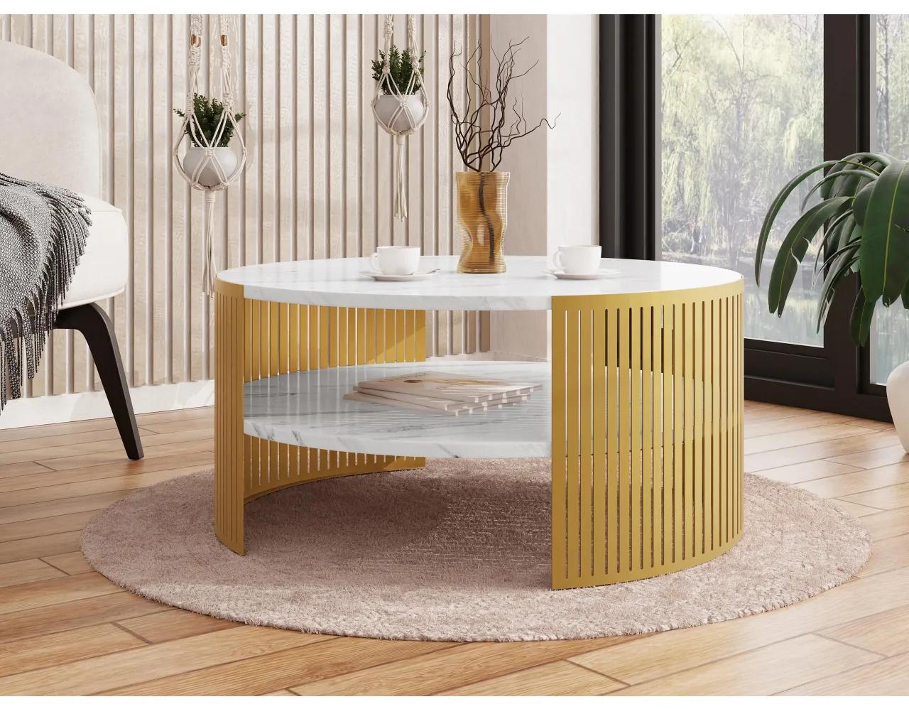 Vneste do svojho priestoru rafinovaný šarm výberom okrúhleho konferenčného stolíka Zinzit Gold. Jedinečný podstavec, ktorým je kovový rám, dodáva nábytku stabilitu a zároveň zvýrazňuje jeho elegantný dizajn.
