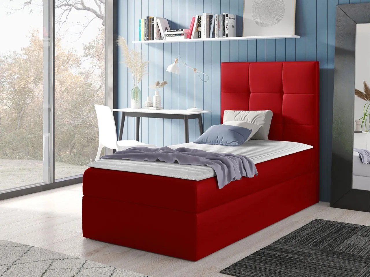 Moderný vzhľad spálne zabezpečuje zvolené zariadenie. Základom je pohodlné miesto na spanie, ktoré poskytuje jednolôžková kontinentálna posteľ Kanvar 2. Niekoľko vrstiev matracov umocňuje pocit pohodlia pri krátkom spánku a nočnom odpočinku. Čalúnená opierka hlavy zase poskytuje mäkkú oporu pre chrbát pri čítaní pred spaním.