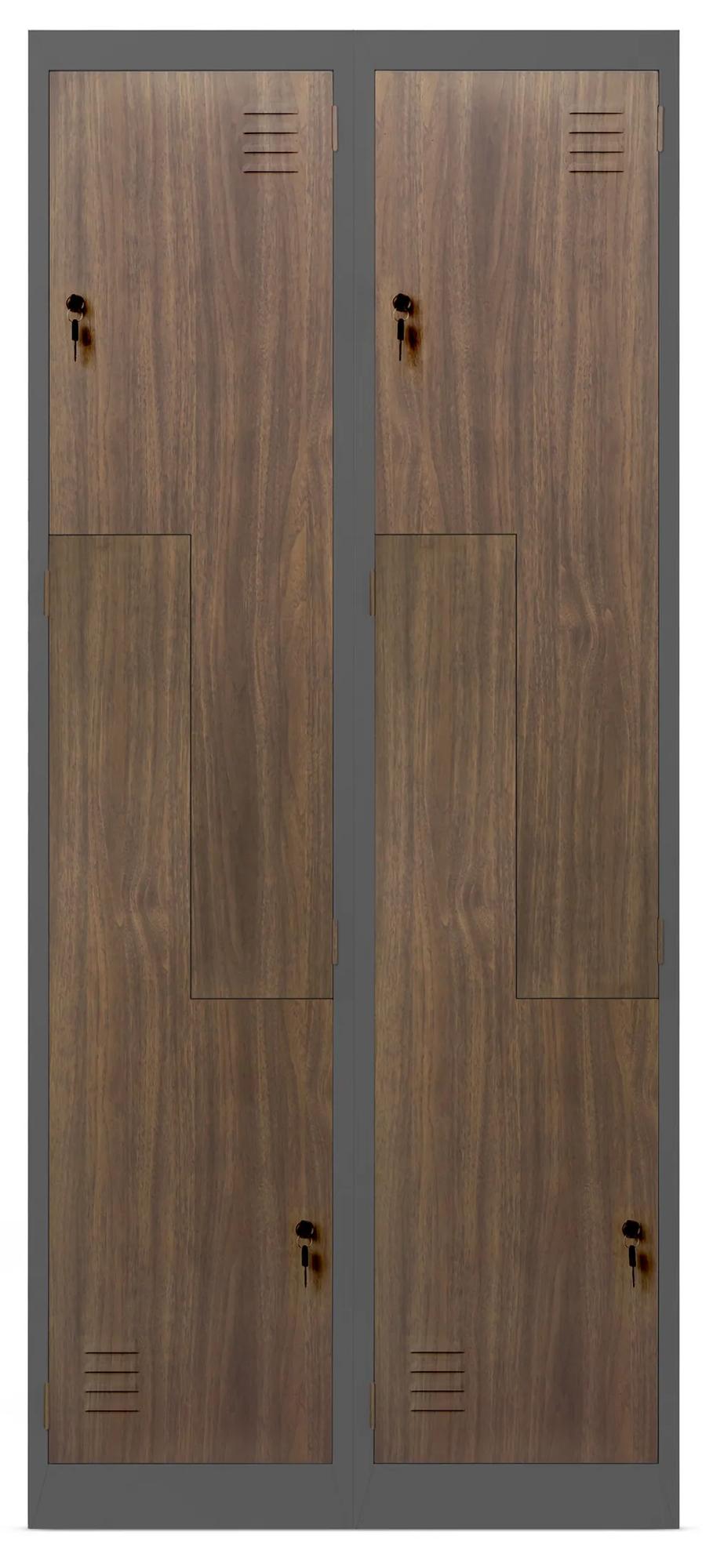 Séria Eco Design je rad celooceľových úžitkových skriniek. Ich zvláštnosťou sú dvierka, ktoré vyzerajú, akoby boli vyrobené z pravého dreva. Vďaka inovatívnemu viacstupňovému výrobnému procesu dokážeme vyrobiť čelá dverí, ktoré farbou aj štruktúrou pripomínajú ozajstný orech. Výsledkom sú kovové skrine s veľmi atraktívnym dizajnom a výberom takéhoto modelu zároveň chránite aj prírodu, pretože neprispievate k výrubu stromov.