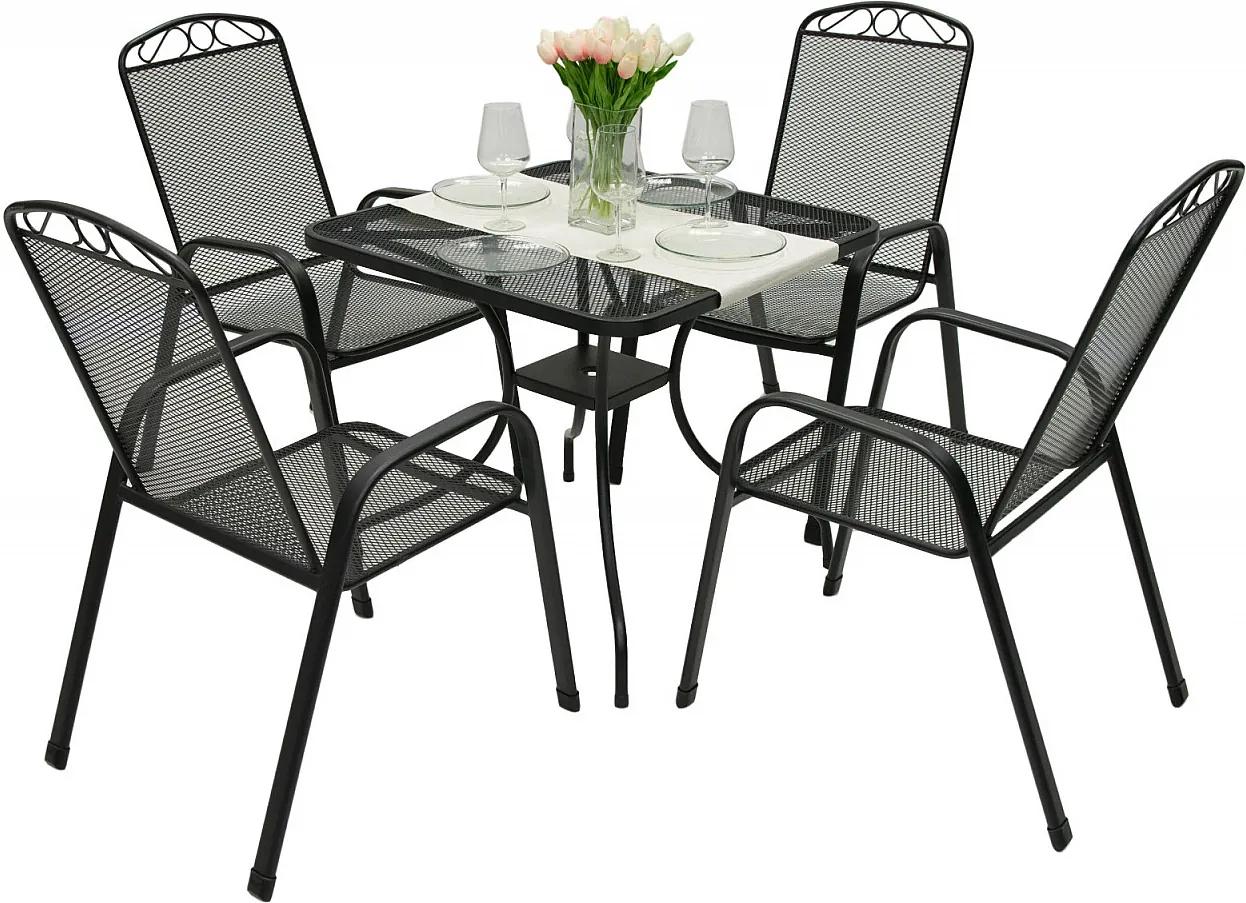 obsahuje štyri elegantné a pevné kovové stoličky s vysokou nosnosťou 120 kg,