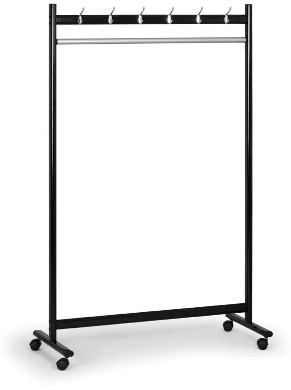 · · konštrukcia vyrobená z oceľových profilov – ovál 50 x 30 mm · povrchová úprava práškovým lakom RAL 9005 čierna a RAL 9006 strieborná · variabilný vešiak s mnohými možnosťami zostavenia – tyč so 6 háčikmi alebo obojstranná tyč s 12 háčikmi na odevy a klobúky, tyč na ramienka či rošt na odloženie tašiek a topánok, je možné rôzne kombinovať · možnosť zakúpiť vešiak s kolieskami s priemerom 50 mm a výškou 80 mm alebo s nôžkami s výškou 30 mm · výška stojanu je 1720 mm, hĺbka 460 mm a šírka 1120 mm · veľkosť odkladacieho roštu je: šírka 325 mm, hĺbka 1040 mm