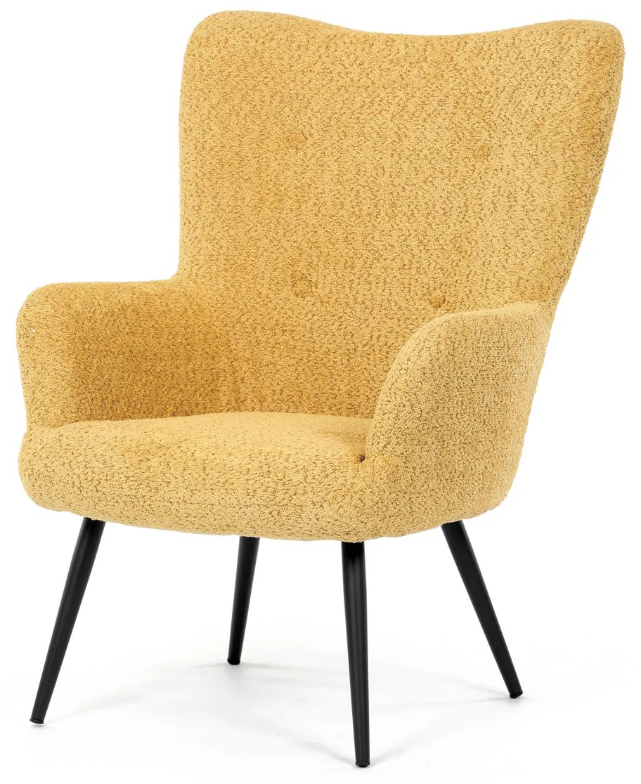 Výnimočne pohodlné kreslo ušiak v modernom dizajne. Hlavným benefitom kresla je kombinácia použitého materiálu a dizajnového spracovania kresla. Na čalúnenie je použitá štýlová látka Bouclé, veľmi príjemná na dotyk, s bohatou výplňou, čo je zárukou pohodlného sedenia. Štýl a výzor kresla udáva kombinácia sviežej žltej farby s elegantnými čiernymi nôžkami, ktoré sú zárukou industriálneho nádychu, taktiež zabezpečia pevnosť a stabilitu kresla. Kreslo je určené do širokého spektra interiérov, svojim spracovaním a výzorom bez problémov zapadne kdekoľvek ho budete potrebovať.