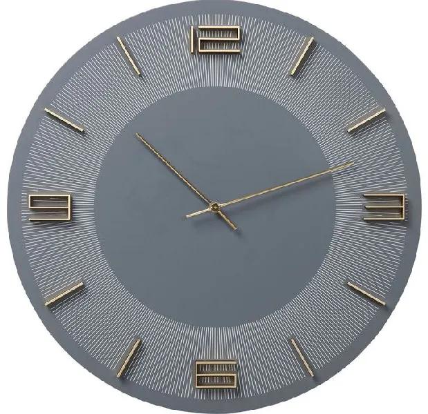 Minimalistické okrúhle nástenné hodiny v štýlovej kombinácii šedej a zlatej farby.