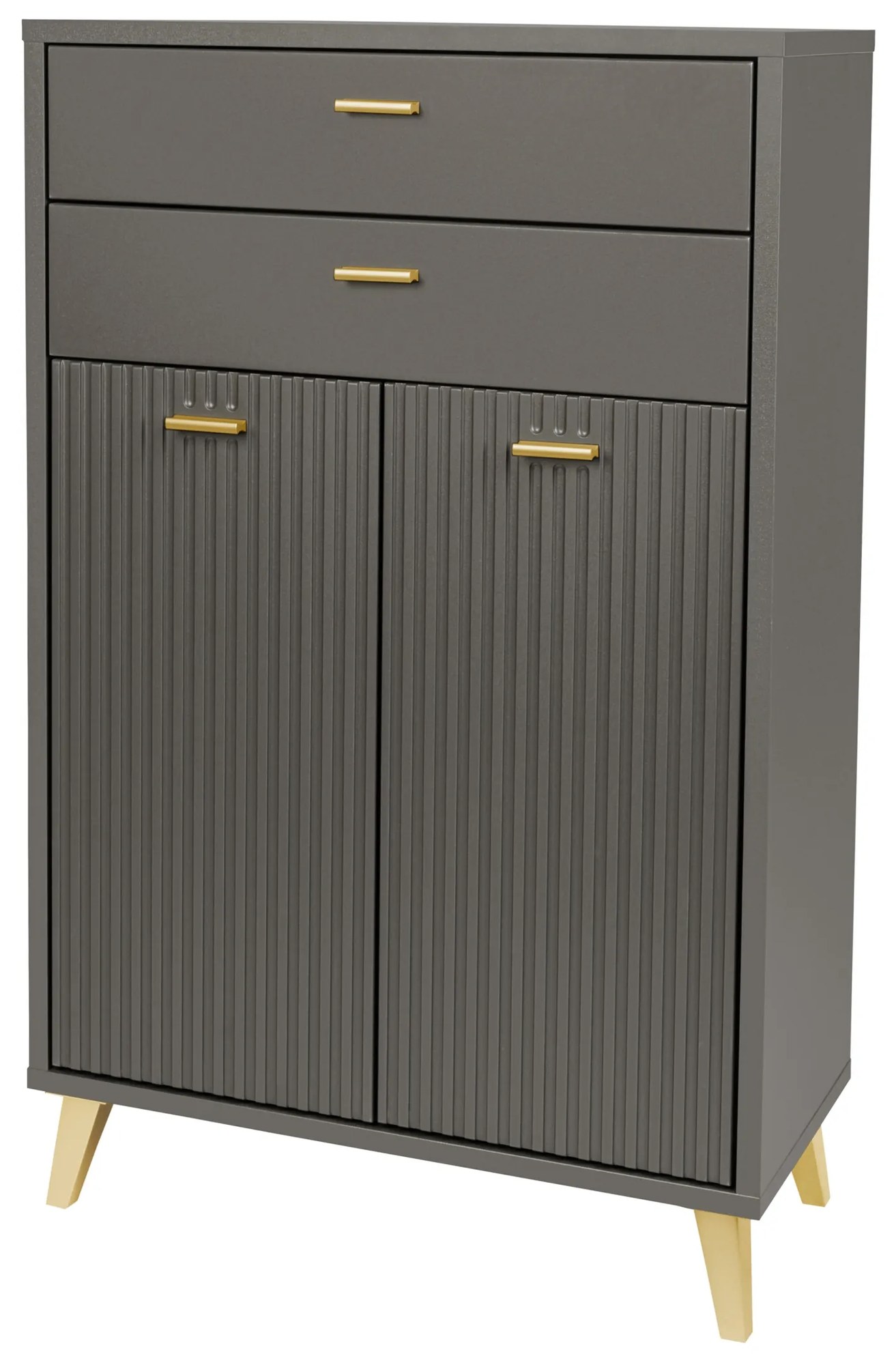 Moderný dizajn s veľkým priestorom Po 2 súpravy rukovätí a nožičiek voliteľne v zlatej alebo čiernej farbe Vyhotovenie v antracitovej farbe s 2 zásuvkami a 2 dvierkami vo zvlnenom vzhľade Stabilná konštrukcia s kvalitnými kovovými kovaniami Prispôsobenie úložného priestoru vkladacími poličkami Dvierka je možné namontovať obojstranne Vrátane 4 rukovätí (zlatá farba), 4 rukovätí (čierna farba), 4 nožičiek (zlatá farba), 4 nožičiek (čierna farba), montážneho materiálu a návodu Max. nosnosť (horná odkladacia plocha): 5 kg Rozmery 60,4 x 96 x 28 cm (Š x V x H) Hmotnosť cca 21,5 kg