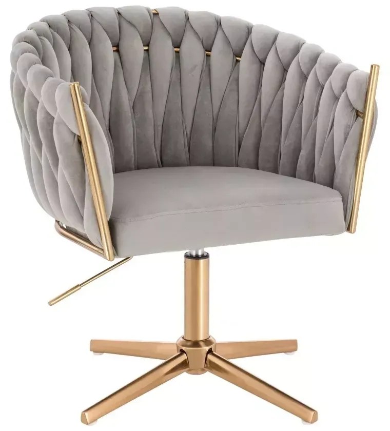 Kreslo NORDEN VELUR na zlatom kríži Krásne, moderné a pohodlné kreslo v škandinávskom štýle dodá iskru každému interiéru. Vďaka svojmu nádhernému dizajnu je vhodné ako pre moderné reštaurácie, bary, exkluzívne obchody, salóny krásy/kaderníctva, elegantné kancelárie, stánky na veľtrhoch alebo informačné miesta, tak aj pre moderné kuchyne. Mäkké sedadlo je potiahnuté velúrovou látkou, je opatrené pevnou kovovou podstavou, ktorá zaisťuje stabilitu kresla. Pre velúr alebo semiš je typický jeho hebký a mäkký povrch. Ide o materiál, ktorý je silnejší, odolnejší a jednoduchší na údržbu ako bežné tkaniny. Technické údaje: – pneumatické nastavenie výšky – otočné sedadlo (360 stupňov) – stabilná kovová podstava – sedák čalúnenie – velúr – šírka sedadla – 50 cm – hĺbka sedadla – 43 cm – min. výška – 40 cm – max. výška – 50 cm – nosnosť 120 kg