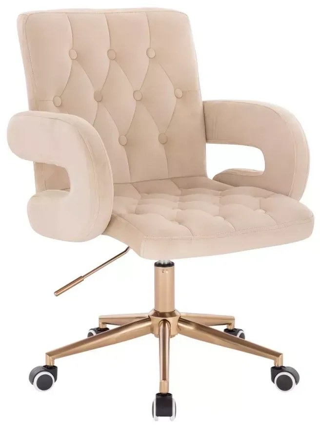 Stolička BOSTON VELUR na zlatej podstave s kolieskamii Luxusný dizajn, hlboké, pohodlné sedadlo potiahnuté príjemným prešívaným semišom, zdobené potiahnutými gombíkmi. Jedná sa o stoličku, ktorá diskrétne zapadá do moderných aj tradičných interiérov. Je vhodná do barov aj moderných kuchýň. Poťah – Velúr – zamatovo hebký, silný, odolný a ľahký na údržbu. Pre velúr alebo semiš je typický jeho hebký a mäkký povrch. Vďaka kolieskam sa s ňou ľahko manipuluje. – pneumatické nastavenie výšky – otočné sedadlo (360stupňov) – kovová základňa s kolieskami Rozmery sedadla na obrázku – minimálna výška. sedadlá od zeme – 40 cm – výška sedadla od zeme max. – 55 cm Nosnosť – 120 kg