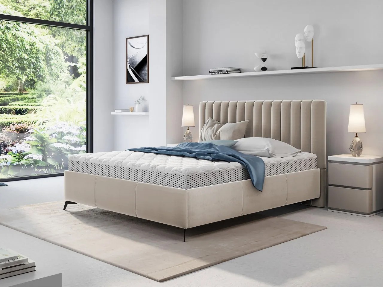 Manželská posteľ Lizubo je vyrobená z čalúnenej látky príjemnej na dotyk, ktorá dokonale zvýrazňuje tvar postele. Zaujímavým ozdobným akcentom je vysoká opierka hlavy so zvislým prešívaním. Dodá vašej spálni dekoratívny nádych a poskytne vám pohodlnú oporu chrbta pri čítaní knihy alebo sledovaní televízie.