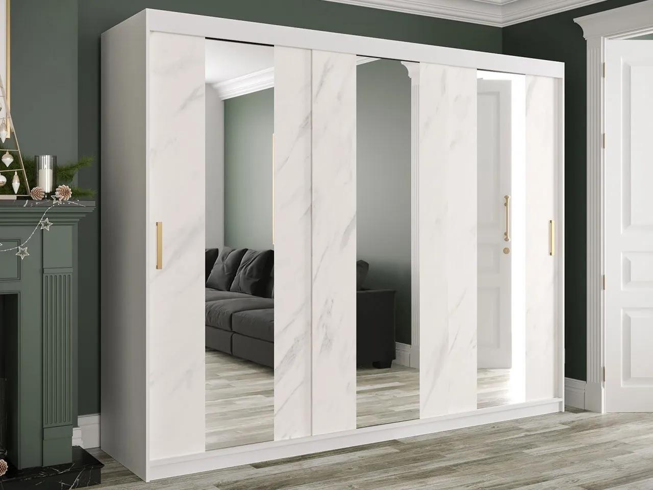 Moderná posuvná skriňa Nonnus 250 Pole dodá vašej spálni elegantný a nadčasový charakter. Použitie tyčí na zavesenie oblečenia a priestranné police zabezpečia najvyššiu úroveň pohodlia. Police možno za príplatok obohatiť o zásuvky – vďaka tomu získa posuvná skriňa na funkčnosti.Zrkadlá, ktoré zdobia prednú časť skrine, rozjasnia miestnosť a opticky ju zväčšia. Tento model je vyrobený z pevnej laminovanej dosky, čelá boli osadené na bežcoch najvyššej kvality. Posuvná šatníková skriňa so zrkadlom je k dispozícii v niekoľkých farebných kombináciách.Rozmery:šírka: 250 cm,výška: 200 cm,hĺbka: 62 cmPrevedenie:16 mm hrubá laminovaná doska,hrany zakončené odolnou a odolnou PVC dyhou,posuvné dvere na vodidlách firmy “BIMAK”, systém “MINI”,kovové rukoväte zlatej farby,zrkadlo na prednej strane,vnútorné police a tyče na šaty,zásuvky (4ks) ako doplnková možnosť za príplatok – vo farbe korpusuZáruka: 24 mesiacov