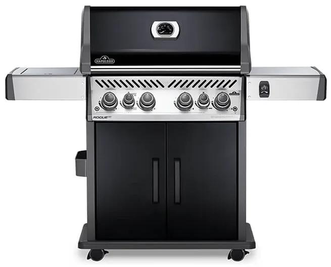 Plynový gril s piatimi horákmi a otočným ražňom s elektrickým motorom v čiernom prevedení.