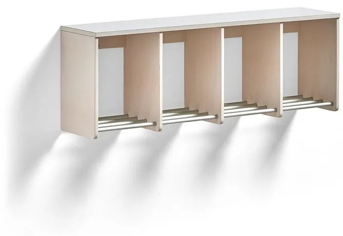 Voľne stojaci stojan na topánky EBBA s odolnými rúrkovými policami. Rúrky zabraňujú hromadeniu nečistôt a vody na polici a deliaca priečka medzi priehradkami poskytuje deťom ich vlastný osobný priestor pre topánky. Stojan na topánky EBBA je flexibilný a štýlový úložný systém, ktorý sa skvele hodí do vstupných miestností materských škôl alebo šatní. Rad EBBA sa skladá z mnohých kusov nábytku, ktoré je možné prispôsobiť vašim požiadavkám. Kombináciou rôznych kusov z tohto radu si môžete jednoducho vytvoriť jedinečné úložné riešenie na mieru. Nábytok EBBA je vyrobený z bielo morenej brezovej preglejky a má hladké, zaoblené kontúry. Dvere priehradiek sú k dispozícii v rôznych farbách ako príslušenstvo. Vyberte si jednu farbu dvierok alebo niekoľko pre skutočne pestrý efekt. Delený model sa skladá z hornej a spodnej časti. Tie je možné použiť spoločne, ale dobre fungujú aj samostatne. Spodná časť je voľne stojaci stojan na topánky. Je vybavený hlbokými prepážkami, ktoré ho rozdeľujú na priehradky. Vďaka tomu môže mať každé dieťa k dispozícii vlastné miesto na uloženie topánok. Polica má rúrkovú konštrukciu, ktorá zabraňuje usadzovaniu prachu a nečistôt na stojane na topánky.