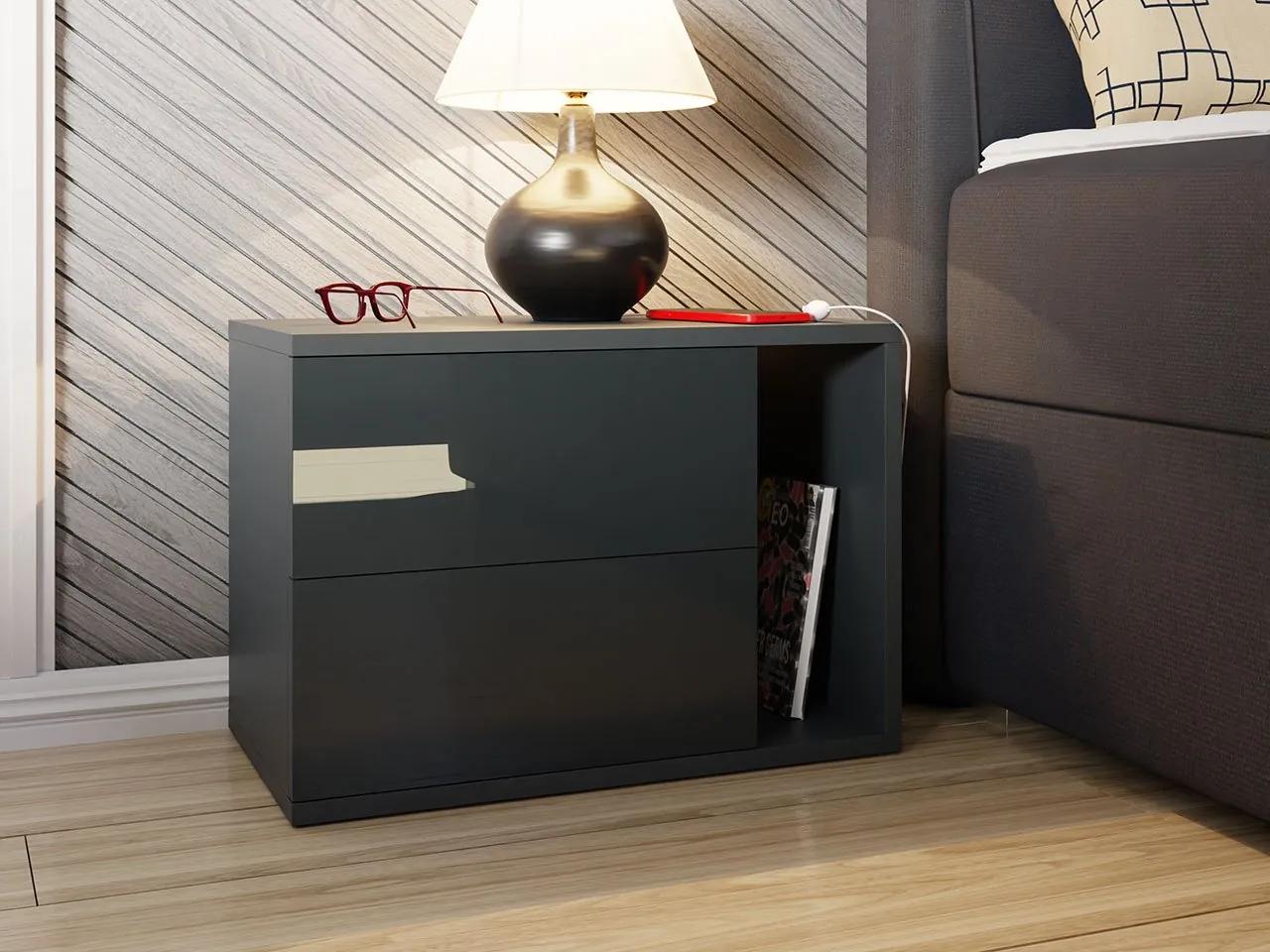 Hľadáte moderný a elegantný nábytok do spálne? Venujte pozornosť nočnému stolíku Lekimo. Vďaka jednoduchému, klasickému tvaru nábytok vyzerá jedinečne, pričom ide o univerzálny dizajn, ktorý sa hodí do mnohých interiérov. Nočný stolík bol vyrobený z pevnej laminovanej dosky – zaručuje dlhú odolnosť. Predné časti sú veľmi lesklé, čo umocňuje moderný charakter nábytku. Skrinka má dve priestranné zásuvky, do ktorých sa zmestia všetky potrebné predmety. Štýlovú nočnú lampu môžete úspešne umiestniť na dosku stola, taktiež tam môžete odložiť knihu alebo notebook.Rozmery:šírka: 57 cm,výška: 40 cm,hĺbka: 32 cmPrevedenie:16 mm hrubá laminovaná doska,lesklé predné diely,PVC ráfik s hrúbkou 0,6 mm,žiadne držadláuniverzálna skrinka (ľavostranná alebo pravostranná)Záruka: 24 mesiacov