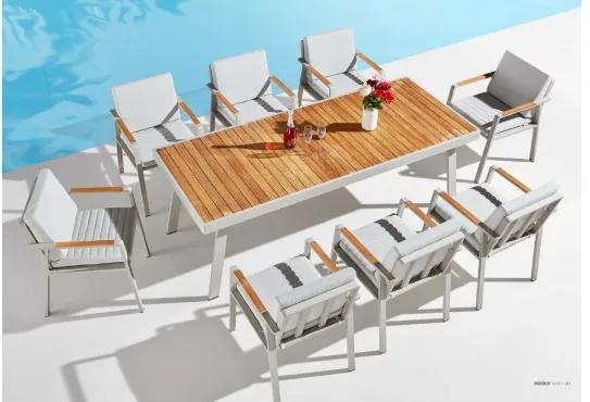 Kolekcia Nofi pozostáva zo sedacej súpravy, modulárnej sedacej súpravy, jedálenskej súpravy, barového setu, ležadla a hojdačky. Je to jedna z kolekcií, ktorá má kompletnú zostavu, aby vyhovela všetkým druhom životných nárokov. S drevenými elementmi, ktoré sú inštalované na podrúčkach a stolových doskách a s jemnými, vzdušnými matracmi, Nofi ukazuje jednoduchosť ale nikdy nestráca svoju pohodlnosť. Rozmery: Stôl 220 x 90 x 75 cm8x Stolička 66 x 56 cm Materiál: Hliník, tíkové drevo Matrace sú súčasťou stoličiek