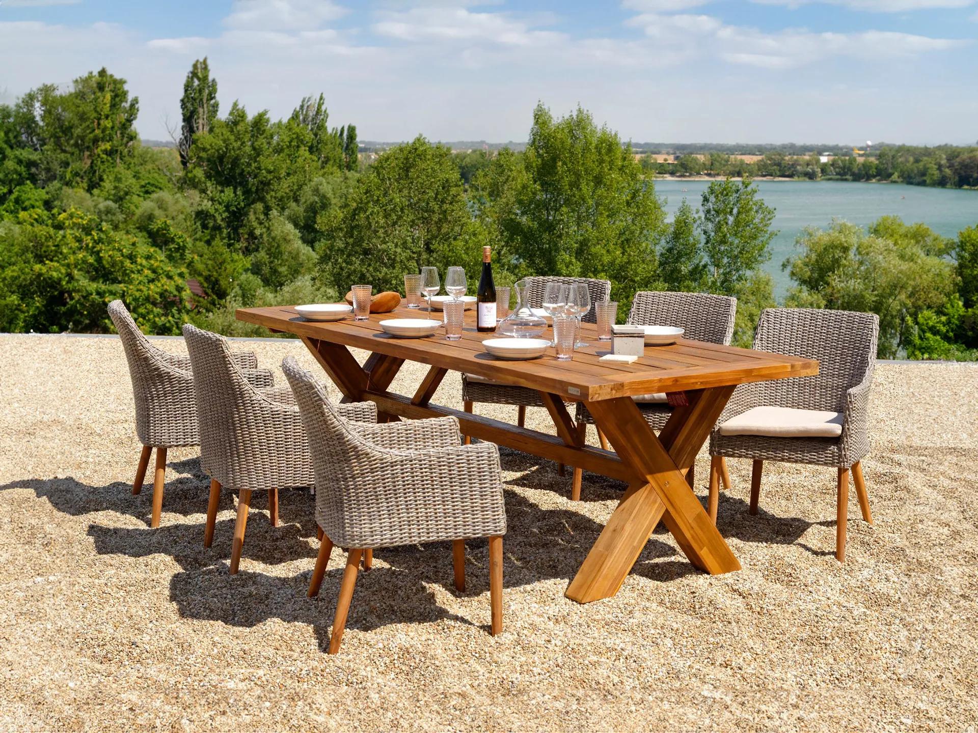Nadčasová 7-dielna stolová zostava Norwick teak Faro s pohodlnými ratanovými kreslami a robustným agátovým stolom očaria nielen vašu rodinu, ale aj priateľov. Titulná fotka zostavy je ilustračná, fotografiu stola zostavy nájdete v galérii.