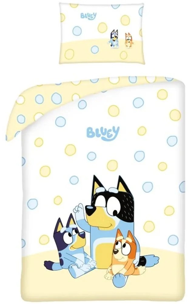 Obliečky Bluey do malej detskej postieľky z jemnej 100% bavlny. Obojstranný dizajn s obrázkami Bluey, Bingo a ich ocka Bandita, ideálny pre malých fanúšikov tejto rozprávkovej rodinky. Rozmery prikrývky 100 x 135 cm a vankúša 40 x 60 cm.