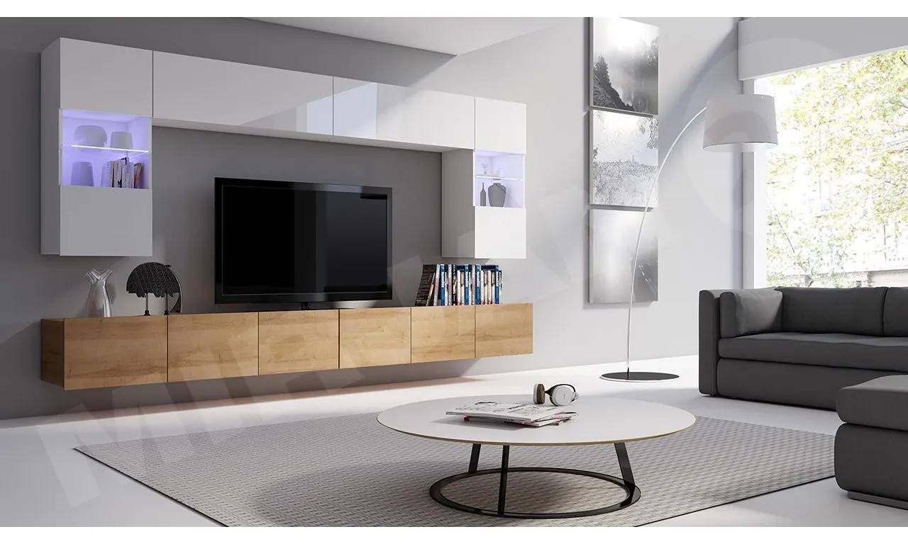 Domů > Obchod > Obývacia stena Bralani I, Farby: dub zlatá / biely + biely lesk, Osvetlenie: osvetlenie LED biele
