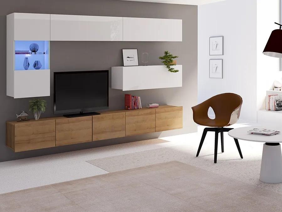 Domů > Obchod > Obývacia stena Bralani IV, Farby: dub zlatá / biely + biely lesk, Osvetlenie: bez osvetlenia