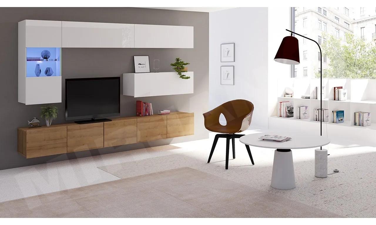 Pri navrhovaní nástennej zostavy Bralani sme zohľadnili funkčnosť každého prvku, ktorý je súčasťou zostavy.Nástenná jednotka Bralani IV sa skladá z 3 uzavretých nástenných políc, 2 RTV skriniek a vitríny s presklením v strednej časti, ktorú možno dodatočne vybaviť LED osvetlením.Nadčasové farby nástennej jednotky a lesklé čelá dokonale ladia s moderným zariadením.Uvedená cena zahrňuje nasledujúce komponenty:TV skrinka Bralani 150 BR04: šírka: 150, výška: 32, hĺbka: 43 x 1ksTV skrinka Bralani 100 BR03: šírka: 100, výška: 32, hĺbka: 43 x 1ksPolice Bralani BR02: šírka: 105, výška: 35, hĺbka: 32 x 3ksZávesná vitrína Bralani BR05: šírka: 45, výška: 117, hĺbka: 32 x 1ksFarby: možnosť výberu farieb tuPrevedenie:korpus – laminovaná drevotriesková – 16mm,dvierka – laminovaná drevotriesková – 15mm,tv skrinka môže byť voľne stojaca (nôžky – strieborné – 5cm) alebo je možné ju zavesiť na stenu,hrany PVC,kalené sklo,bez úchytiek,s možnosťou dokúpenia LED osvetlenia studené biele alebo modré,súčasťou zostavy sú pliešky k montáži na stenu, ale súčasťou nie sú montážne hmoždinkyZáručná doba: 24 mesiacov