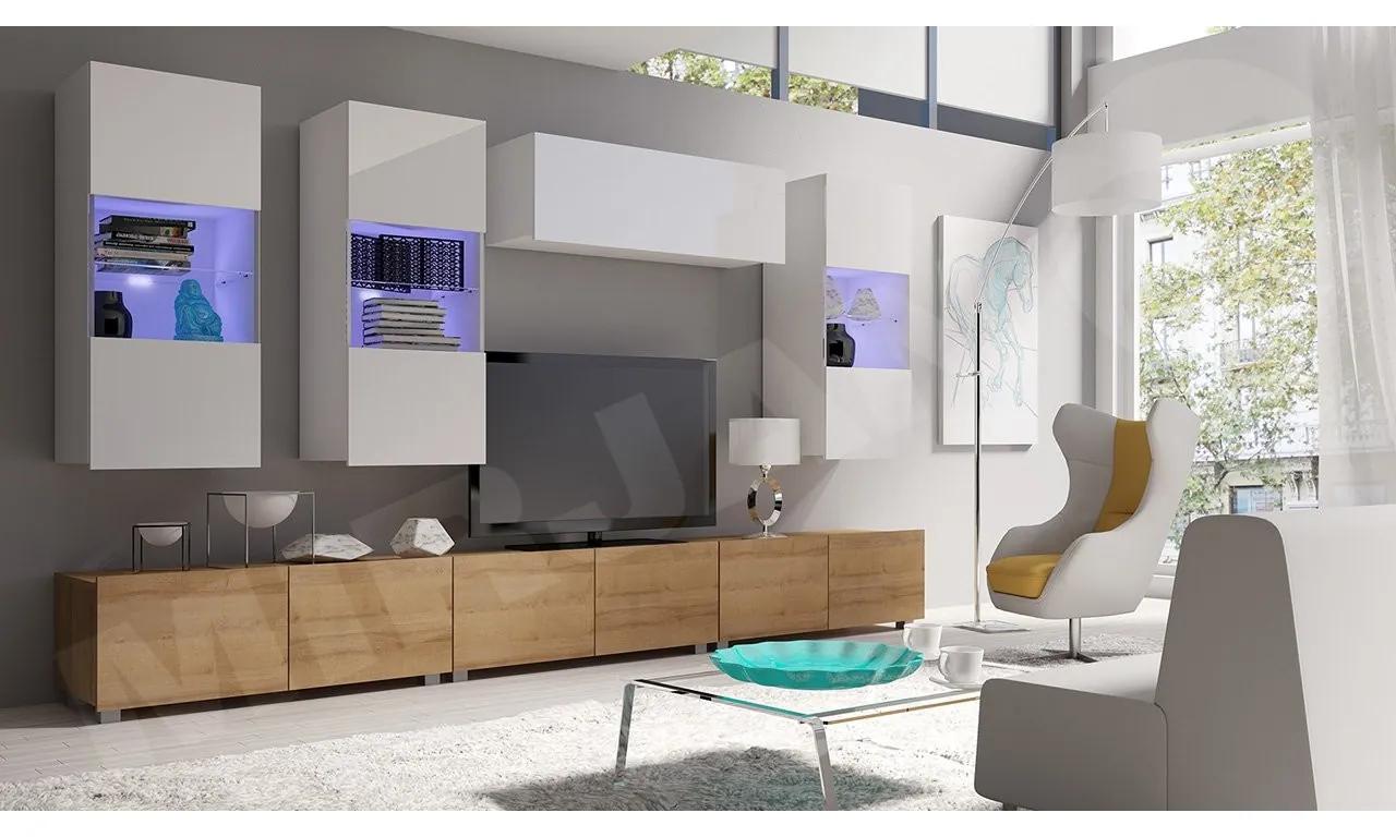 Obývacia stena Bralani je ideálna súprava do obývačky alebo salónu. Čelá nástennej skrinky sú vyrobené vo vysokom lesku, čím získavajú moderný štýl. Dokonale tak vystavíte svoje RTV vybavenie. Súprava sa skladá až zo 7 prvkov, medzi ktoré patrí: 3 nástenných skriniek, 3 univerzálnych skriniek a uzavretej skrinky. Po spojení môže byť súprava dlhá až 3 metre. Skrinky RTV si môžete prispôsobiť svojej obývačke, pretože ich môžete zavesiť a postaviť na nožičky. Súprava nemá žiadne úchytky, čo jej dodáva minimalistický charakter, a možnosť dokúpenia LED osvetlenia je veľmi úsporným riešením.Uvedená cena zahrňuje nasledujúce komponenty:TV skrinka Bralani 100 BR03: šírka: 100, výška: 37, hĺbka: 43 x 3ksZávesná vitrína Bralani BR05: šírka: 45, výška: 117, hĺbka: 32 x 3ksPolice Bralani BR02: šírka: 105, výška: 35, hĺbka: 32 x 1ksFarby: možnosť výberu farieb tuPrevedenie:korpus – laminovaná drevotriesková – 16mm,dvierka – laminovaná drevotriesková – 15mm,tv skrinka môže byť voľne stojaca (nôžky – strieborné – 5cm) alebo je možné ju zavesiť na stenu,hrany PVC,kalené sklo,bez úchytiek,s možnosťou dokúpenia LED osvetlenia studené biele alebo modré,súčasťou zostavy sú pliešky k montáži na stenu, ale súčasťou nie sú montážne hmoždinkyZáručná doba: 24 mesiacov