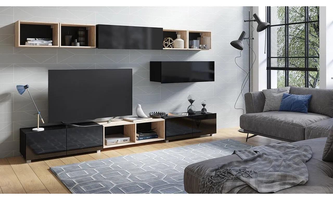 Hľadáte riešenia modernej obývacej izby, ktoré budú praktické ? Ak áno, nezabudnite sa pozrieť na našu ponuku – obývacia stena Bralani!Obývacia stena sa skladá z dvoch segmentov: horného a dolného. Horná časť nástennej jednotky ponúka vďaka otvoreným poličkám veľa priestoru na zobrazenie vašich obľúbených fotografií, suvenírov alebo kníh. Otvorené police tiež spôsobujú, že stenová jednotka vyzerá ľahko a elegantne. Okrem toho sú v hornej časti dva skrinky, v ktorých môžete ukladať menej elegantné predmety. Spodná časť nástennej jednotky ponúka dva skrinky a jednu otvorenú poličku. Môžete zavesiť spodnú časť nástennej jednotky na stenu alebo postaviť na nohy, ktoré sú súčasťou súpravy.Rozmery prvkov súpravy:Závesná polica Bralani BR02: – x 2,šírka: 105 cm, výška: 35 cm, hĺbka: 32 cm,Televízna skrinka Bralani 100 BR03: – x 2,šírka: 100 cm, výška: 37 cm, hĺbka: 43 cm,Závesná polica 50 Bralani BR14: – x 4,šírka: 50 cm, výška: 33 cm, hĺbka: 30 cm,Závesná polica 100 Bralani BR15:šírka: 100 cm, výška: 31 cm, hĺbka: 41 cmprevedenie:korpus: 16 mm laminovaná drevotrieska,fronty: 15 mm laminovaná drevotrieska,Hrana z PVC na prednej stranebez úchytiek,Televízna jednotka a polica BR14 / 15 sú univerzálnym prvkom – stojace (5cm strieborné nohy) alebo závesné,platne na pripevnenie skriniek k stene v súprave, žiadne montážne kolíky (zákazník si musí kúpiť vlastné)Záruka: 24 mesiacov