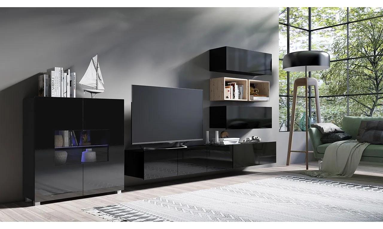Domů > Obchod > Obývacia stena Bralani XXVIII, Farby: čierna + čierny lesk + dub artisan, Osvetlenie: osvetlenie LED modré