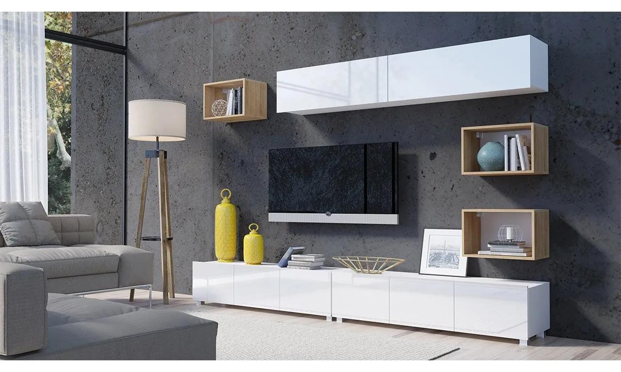 Štýlová obývacia stena Bralani XXXI je kombináciou dvojice televíznych skriniek, ktoré sú doplnené otvorenými a zatvorenými závesnými policami. O konečnom usporiadaní nábytku sa rozhodujete počas montáže, takže si stenu môžete prispôsobiť podľa svojho vkusu, ako aj tvaru a veľkosti miestnosti.Výhodou je tiež možnosť nahradiť štandardný spôsob umiestnenia nástennej jednotky na podlahu. Podľa vlastného uváženia môžete zavesiť aj skrinky na stenu, čo dodáva interiéru obývačky dojem priestrannosti a optického zväčšenia.Rozmery prvkov súpravy:Bralani BR02 závesná polica: – x 2šírka: 105 cm, výška: 35 cm, hĺbka: 32 cm,TV skrinka Bralani 150 BR04: – x 2šírka: 150 cm, výška: 32 cm, hĺbka: 43 cm,Závesná polica 50 Bralani BR14: – x 3šírka: 50 cm, výška: 33 cm, hĺbka: 30 cmprevedenie:korpus: 16 mm laminovaná drevotrieska,fronty: 15 mm laminovaná drevotrieska,Hrana z PVC na prednej stranebez úchytiek,Televízna jednotka a polica BR14 sú univerzálnym prvkom – stojace (5cm strieborné nohy) alebo závesné,platne na pripevnenie skriniek k stene v súprave, žiadne montážne kolíky (zákazník si musí kúpiť vlastné)Záruka: 24 mesiacov