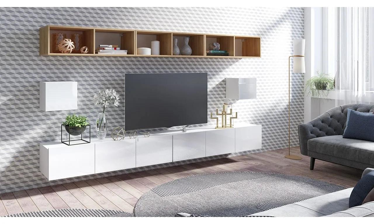 Jednoduchý a moderný vzhľad obývacej steny Bralani XXXIV je dôsledkom série symetrických závesných políc a sprievodných televíznych skriniek. Lineárne usporiadanie dodáva interiéru dojem harmónie a sviežosti. Ak dávate prednosť trochu avantgardnejšiemu usporiadaniu, môžete nástennú jednotku samozrejme prispôsobiť vašim vlastným preferenciám, ako aj obmedzeniam stanoveným v usporiadaní miestnosti.Jednotlivé skrinky, ktoré sú súčasťou nástennej jednotky, sú univerzálne, vďaka čomu sú ideálne zavesené na stene aj štandardne na podlahe.Rozmery prvkov súpravy:TV skrinka Bralani 150 BR04: – x 2šírka: 150 cm, výška: 37 cm, hĺbka: 43 cm,Uzavretá závesná polica Bralani BR07: x 2šírka: 34 cm, výška: 34 cm hĺbka: 32 cm,Závesná polica 100 Bralani BR15: – x 3šírka: 100 cm, výška: 31 cm, hĺbka: 41 cmprevedenie:korpus: 16 mm laminovaná drevotrieska,fronty: 15 mm laminovaná drevotrieska,Hrana z PVC na prednej stranebez úchytiek,Televízna jednotka a polica BR15 sú univerzálnym prvkom – stojace (5cm strieborné nohy) alebo závesné,platne na pripevnenie skriniek k stene v súprave, žiadne montážne kolíky (zákazník si musí kúpiť vlastné)Záruka: 24 mesiacov