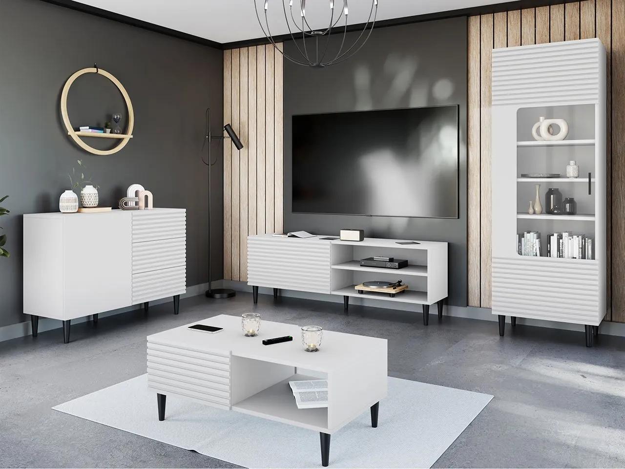 Nábytok do obývačky Sorleto II premení váš interiér a dodá mu jedinečný charakter. Vyznačujú sa nezvyčajnými detailmi – vysokými kužeľovitými nohami a dekoratívne frézovanými čelami. Takáto kombinácia dodáva neobyčajnú eleganciu a modernosť.Komfort používania izbového nábytku zvyšuje systém push to open. Vďaka nemu zabudnete na tradičné úchytky – stačí jemne stlačiť prednú časť a nábytok sa ľahko otvorí.Priestranný interiér nábytkovej zostavy uľahčuje každodenné využívanie priestoru. Priestranné police a hlboké zásuvky poskytujú priestor na uloženie rôznych predmetov, od oblečenia cez bytový textil až po dokumenty.Rozmery jednotlivých častí súpravy:Sorleto 1D3SZ izbová komoda:šírka: 104 cm, výška: 76 cm, hĺbka: 40 cm,RTV 150 Skrinka Sorleto 1K1P:šírka: 150 cm, výška: 53 cm, hĺbka: 40 cm,Sorleto 1K konferenčný stolík:šírka: 100 cm, výška: 41 cm, hĺbka: 52 cm,Sorleto 1D vitrína: šírka: 60 cm, výška: 180 cm, hĺbka: 40 cmPrevedenie:korpus: 16 mm hrubá laminovaná drevotrieska,čelá: 16 mm MDF doska potiahnutá PVC,hrany: PVC a papier,nožičky: drevené, kónické v čiernej farbe,rukoväť: čierny plast (vitrína),plechové závesy FI 35,Spodné lišty QUATRO,spomaľovače/plynové pohony,bez rukovätí,systém otvárania “PUSH TO OPEN”,priehľadné sklo (výklad)Záruka: 24 mesiacov