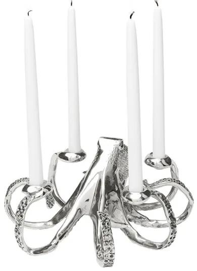 Trblietavý strieborný svietnik v tvare chobotnice s držiakmi pre štyri sviečky.